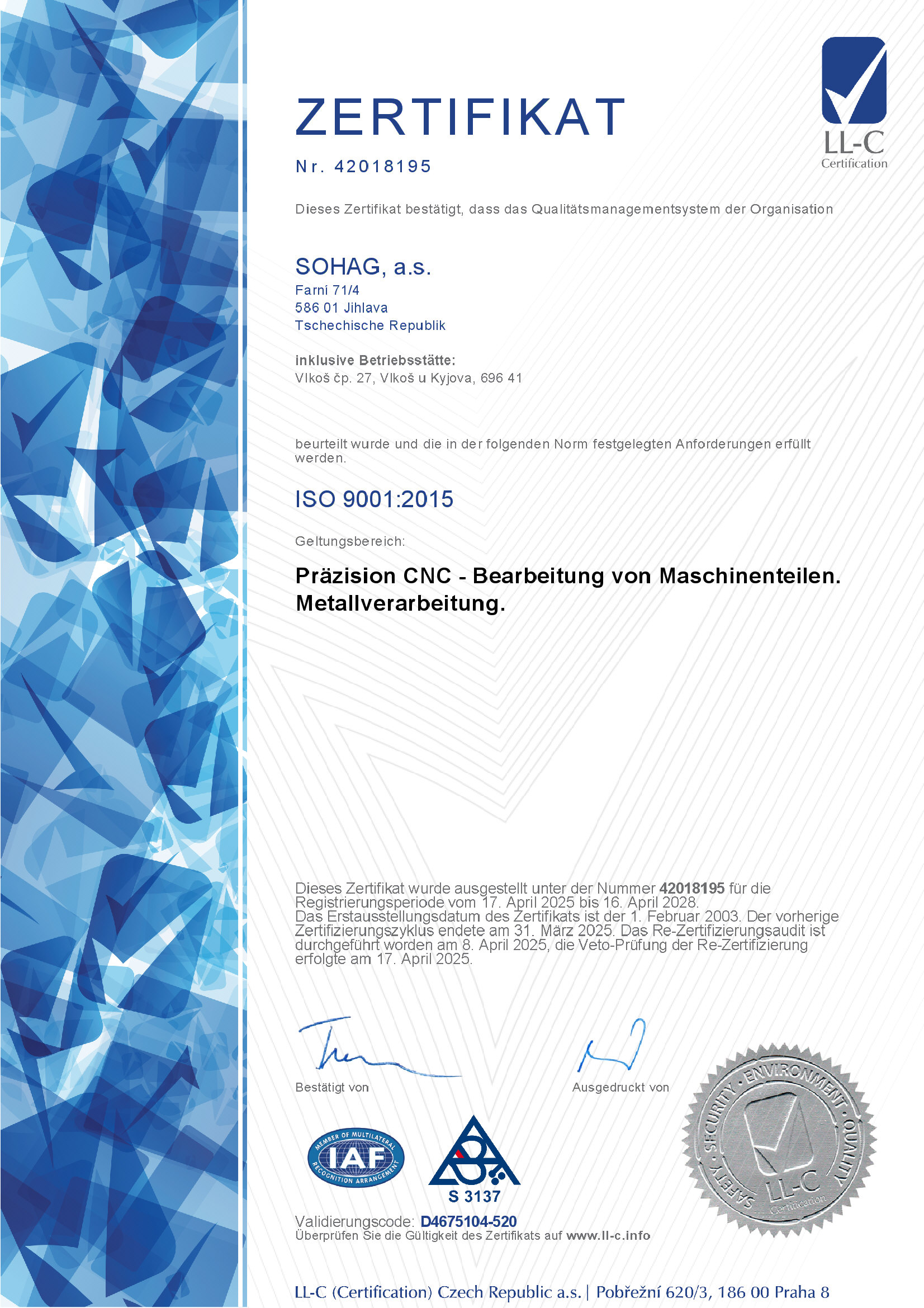 Zertifikate Das Qualitätsmanagementsystem der Aktiengesellschaft bescheinigen die Zertifikate gem. der Norm ISO 9001:2015 und ISO/TS 16949:2009. Das Umweltverhältnis und das umweltfreundliche Verhalten deklariert das Zertifikat gem. ČSN ISO 14001:2015. ISO9001_DE_25ISO14001_DE_253 Zertifikat ISO 9001:20015 herunterladen (PDF-Datei) Zertifikat ISO 14001:2015 herunterladen (PDF-Datei) Zertifikat ISO/TS 16949:2009 herunterladen (PDF-Datei)